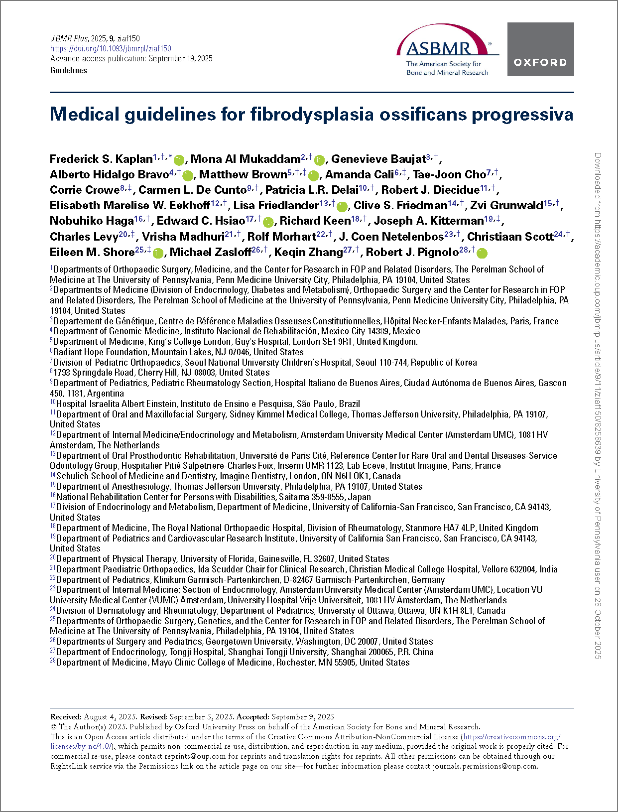 “During the past 25 years, the Fibrodysplasia Ossificans Progressiva (FOP) community has moved from the wastelands of a rare disease to the watershed of clinical trials. Together, we identified the genetic cause of FOP and used that knowledge to spearhead worldwide research efforts to develop therapies that will transform the care of individuals with FOP. We have expanded the frontiers of discovery and drug development, dismantled the physical and perceptual barriers that have impeded progress, and inspired global research in small molecules, antibodies, and gene therapy for FOP. We have formulated best practices and assembled teams of experts to optimize ambulatory and in-patient care of the FOP patient.”