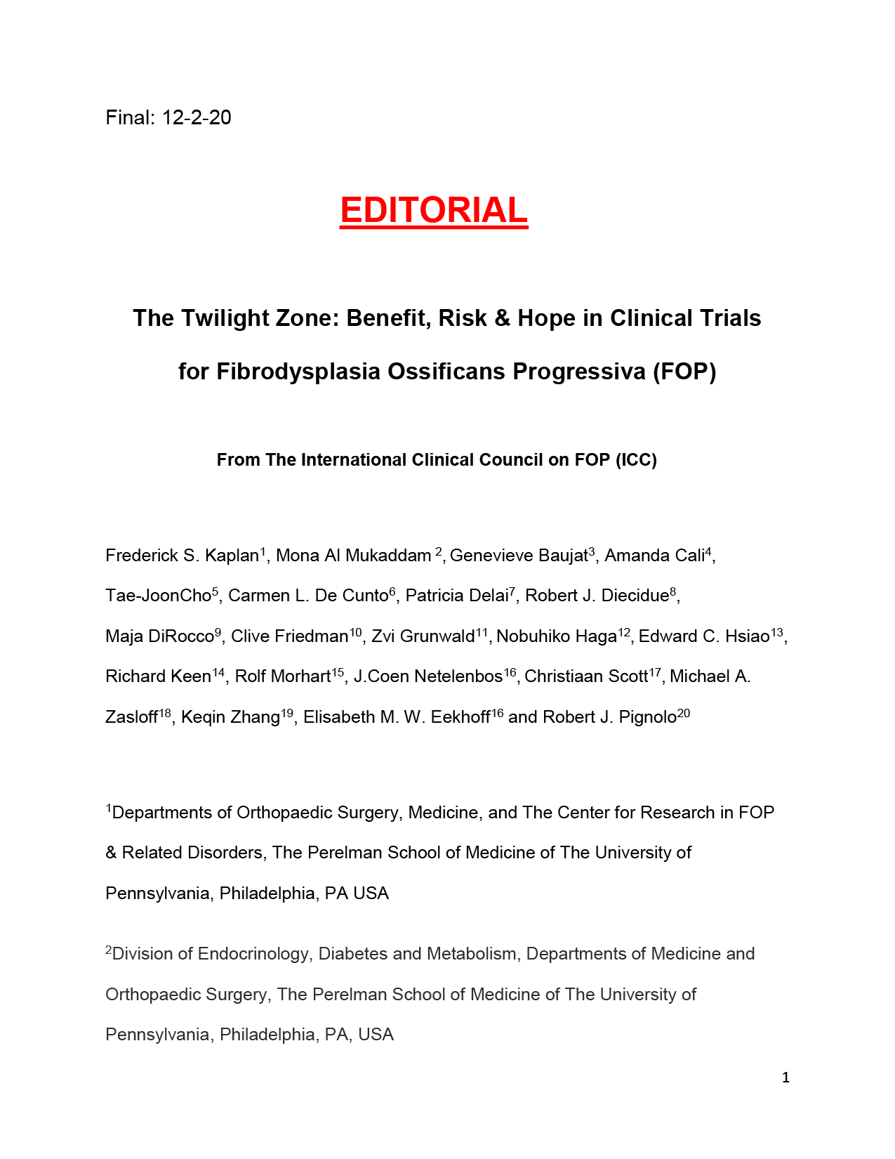 In June 2017, the International Clinical Council (ICC) on FOP was established to consolidate a global voice for the best practices for clinical care and clinical research for people who suffer from FOP.